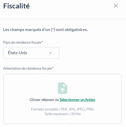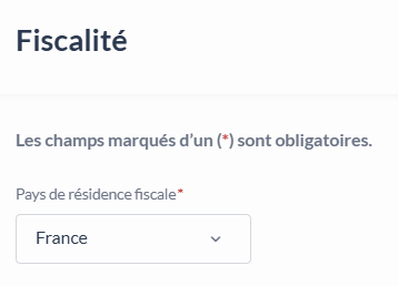 Votre résidence fiscale peut ainsi être différente de votre adresse postale. Nous vous demanderons cependant de confirmer cette information en ajoutant une attestation de résidence fiscale au moment de l'enregistrement de vos informations personnelles, afin d'éviter toute erreur :