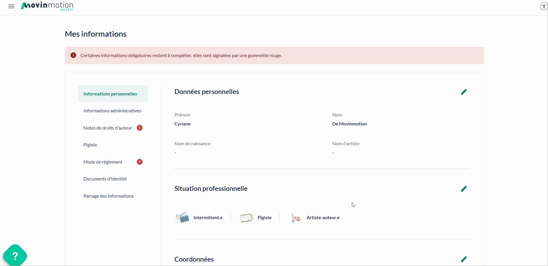 Sur Movinmotion, vous pouvez (si vous le souhaitez) ajouter à votre fiche d'informations administratives (indispensables à vos embauches pour l'édition de vos documents de paie), vos documents légaux :