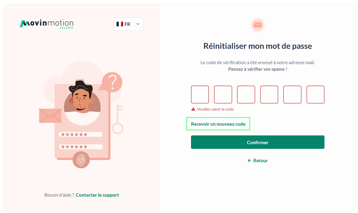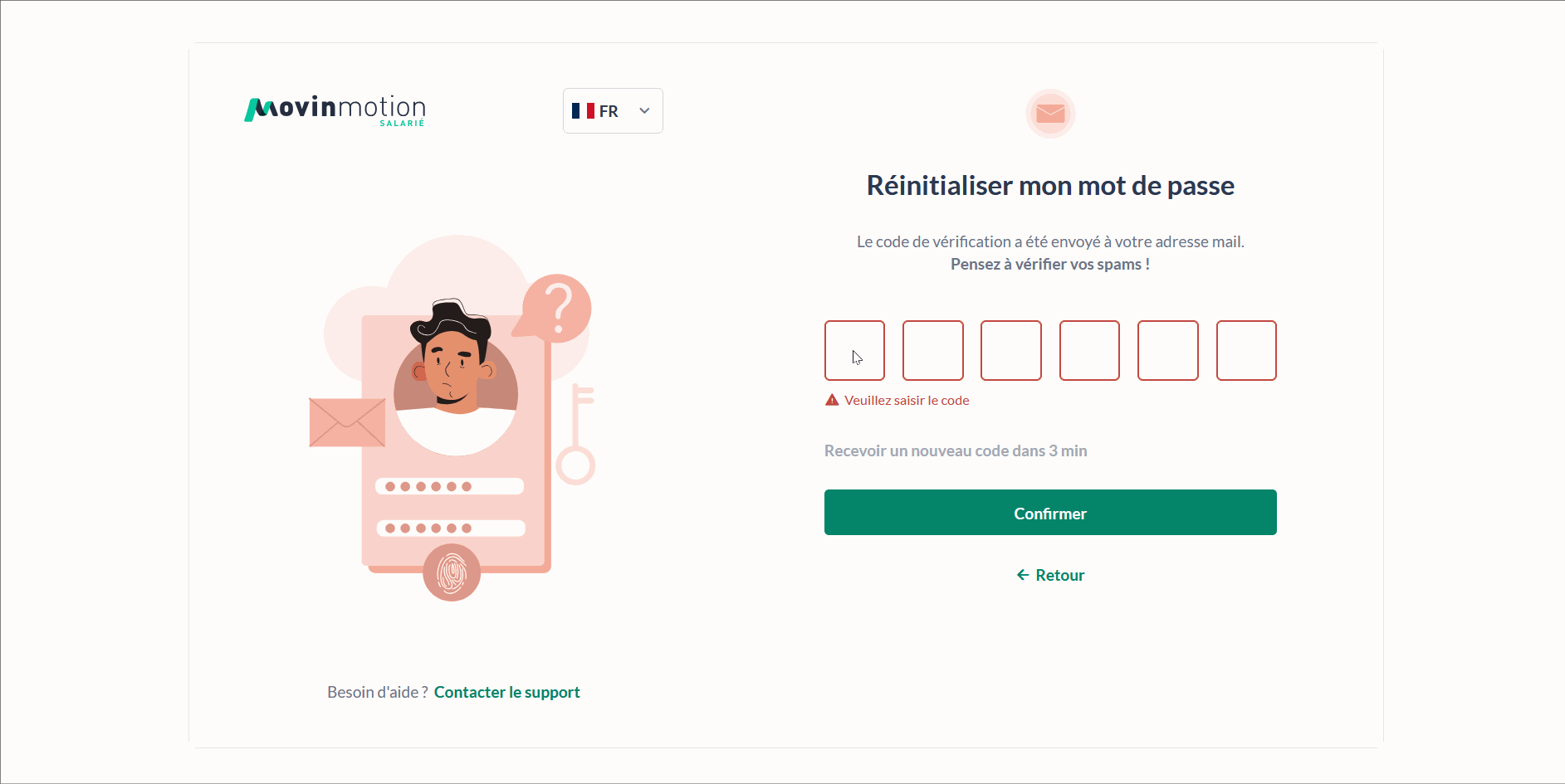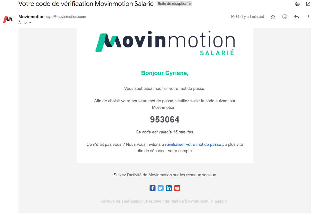 Un code de réinitialisation vous sera envoyé par email, à condition que l’email saisi corresponde bien à l'adresse de connexion de votre compte actif Movinmotion. Celui-ci est valable durant 15 minutes.