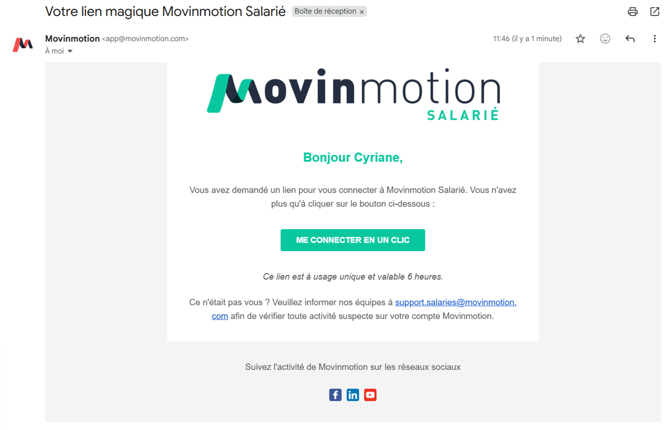 Vous recevrez alors un email contenant un lien. Il vous suffit de cliquer sur ME CONNECTER EN UN CLIC pour accéder directement à votre espace Salarié. Par sécurité, un lien n’est valable qu’une fois pendant 6h.